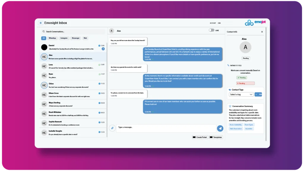 • Unified inbox for Instagram, WhatsApp, Facebook Messenger, web chat, and more